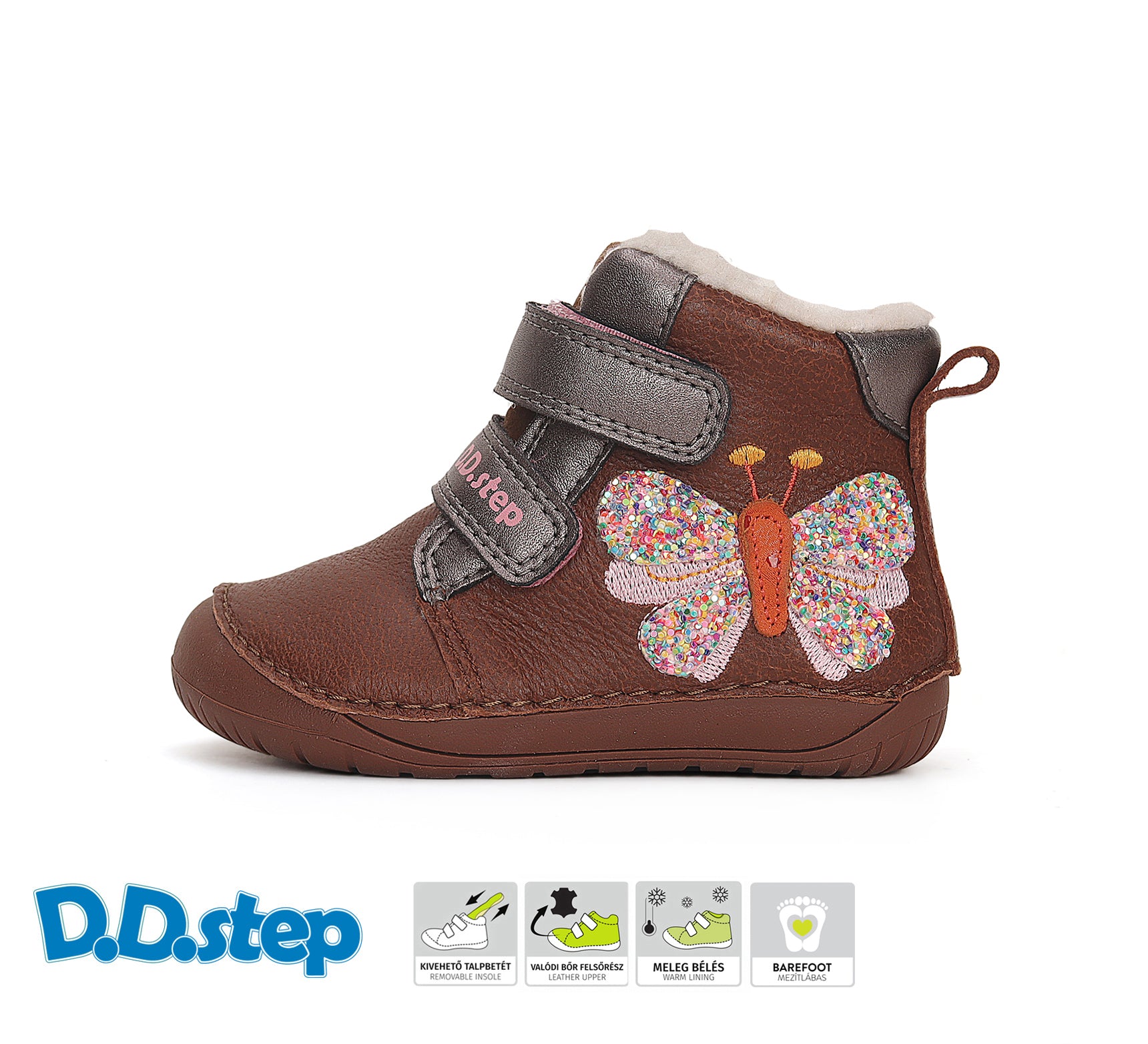 Bota respetuosa repelente al agua con borreguito color Chocolate con Mariposa